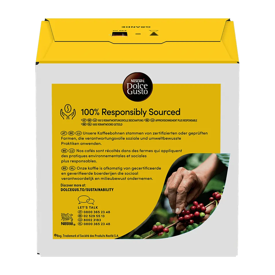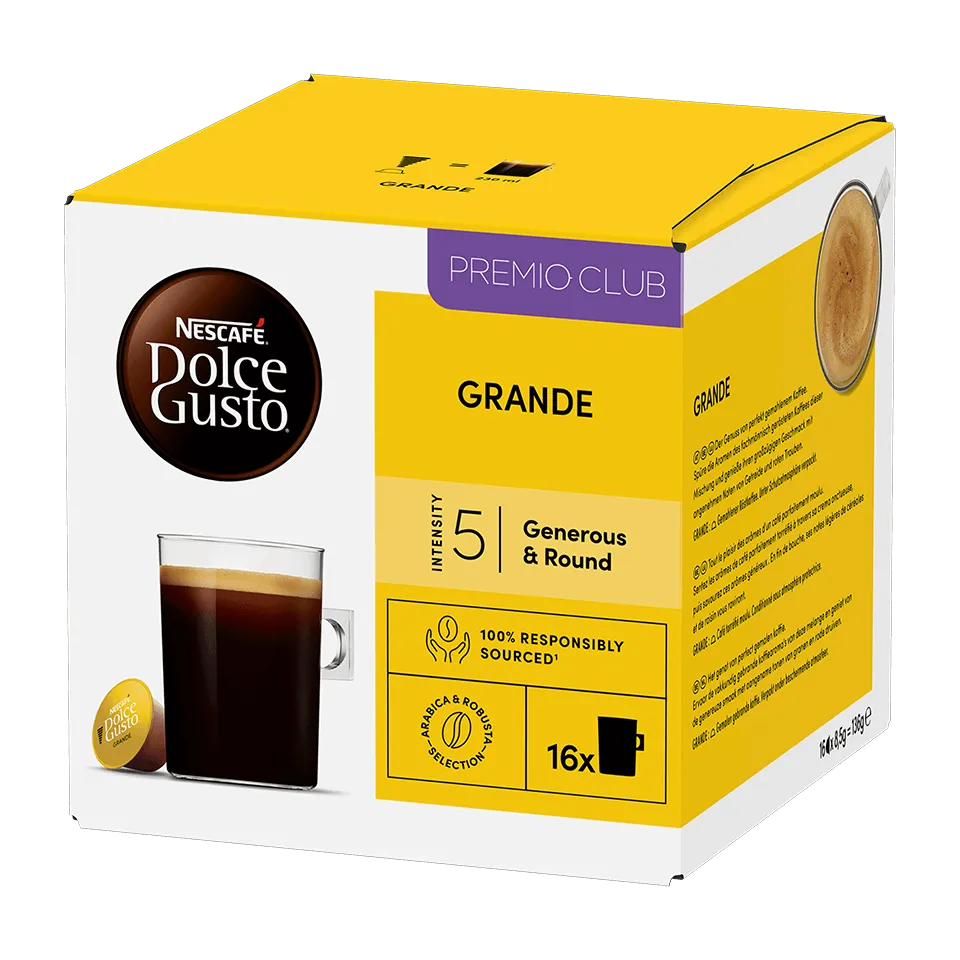 Hergestellt aus sorgfältig ausgewählten Arabica-Bohnen, wird NESCAFÉ® Dolce Gusto® Grande seinem Namen mit jedem Schluck gerecht. Schmecke die angenehmen Noten von geröstetem Getreide und roter Traube, die diesen Kaffee so herrlich köstlich machen.