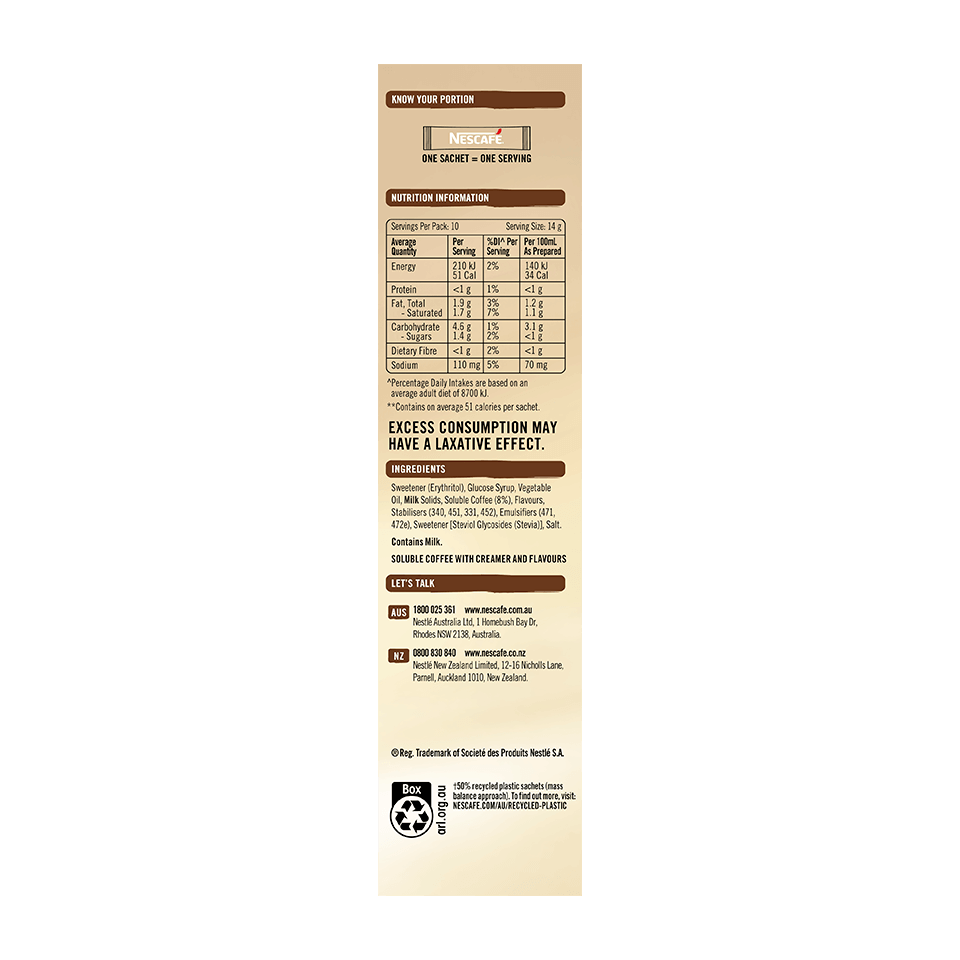 Sachet: Sweetener (Erythritol), Glucose Syrup, Vegetable Oil, Soluble Coffee (10%), Milk Solids, Flavours, Stabilisers (340, 451, 331, 452), Emulsifiers (471, 472e), Sweetener [Steviol Glycosides (Stevia)], Salt