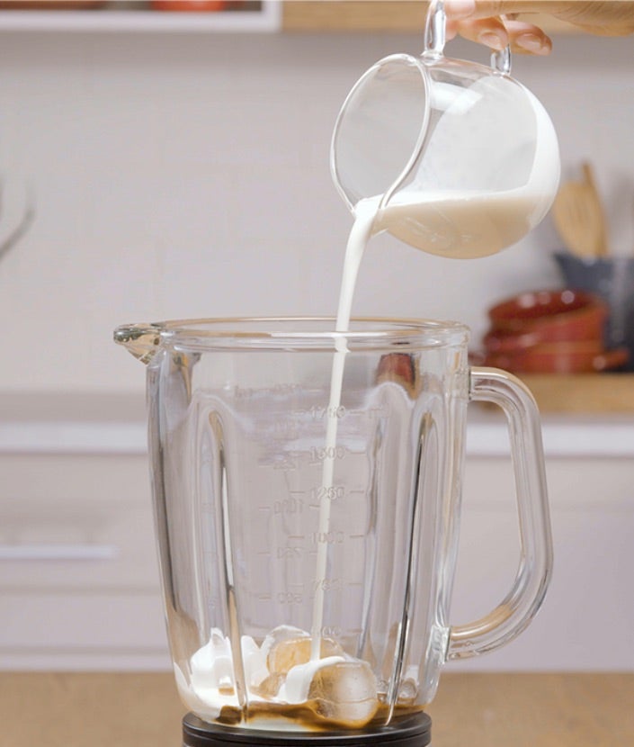 Froth 140 ml milk in a separate jug. Pour the frothed milk into a serving glass filled with ice