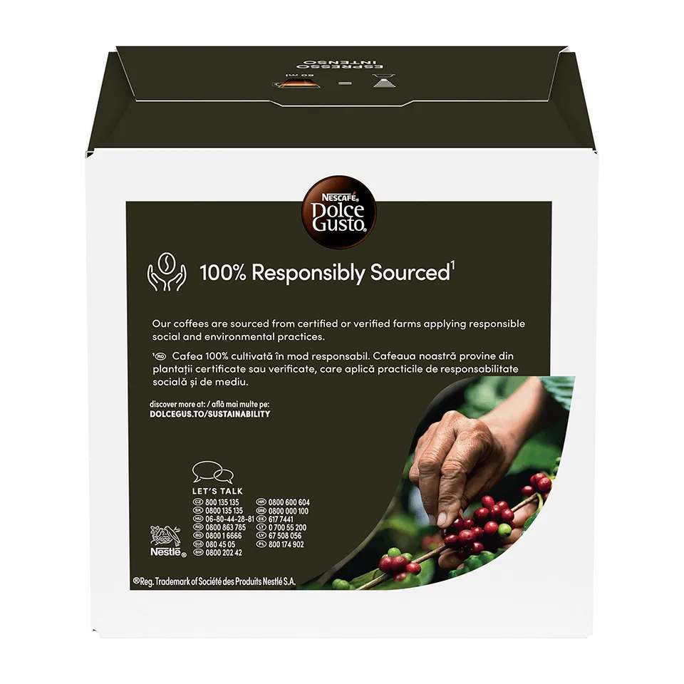 NESCAFÉ® Dolce Gusto® Espresso Intenso yra kruopščiai subalansuotas pupelių iš priešingų planetos pusių derinys. Arabikos pupelės iš Kolumbijos ir robustos pupelės iš Vietnamo puikiai dera tarpusavyje ir sukuria išties įspūdingą, gaivinamai intensyvią espreso kavą.