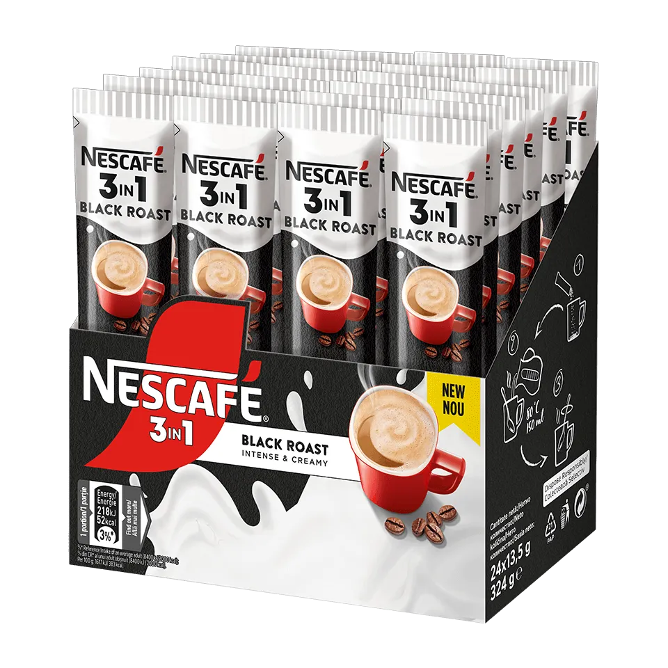 Открий новото NESCAFÉ 3in1 Black Roast, дръзка комбинация от интензивен кафе аромат от дълго изпечени кафе зърна и кадифен млечен вкус. Наслади се на страхотна чаша кафе, направена за секунди.