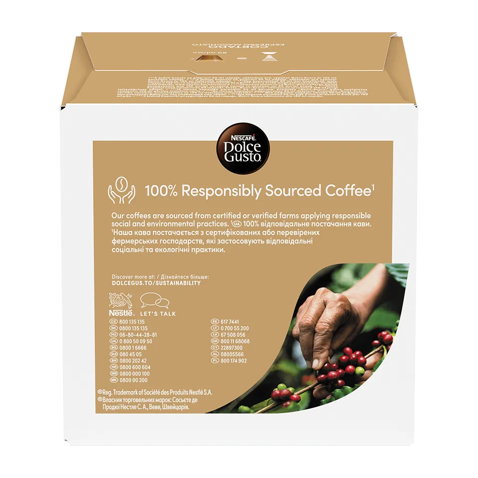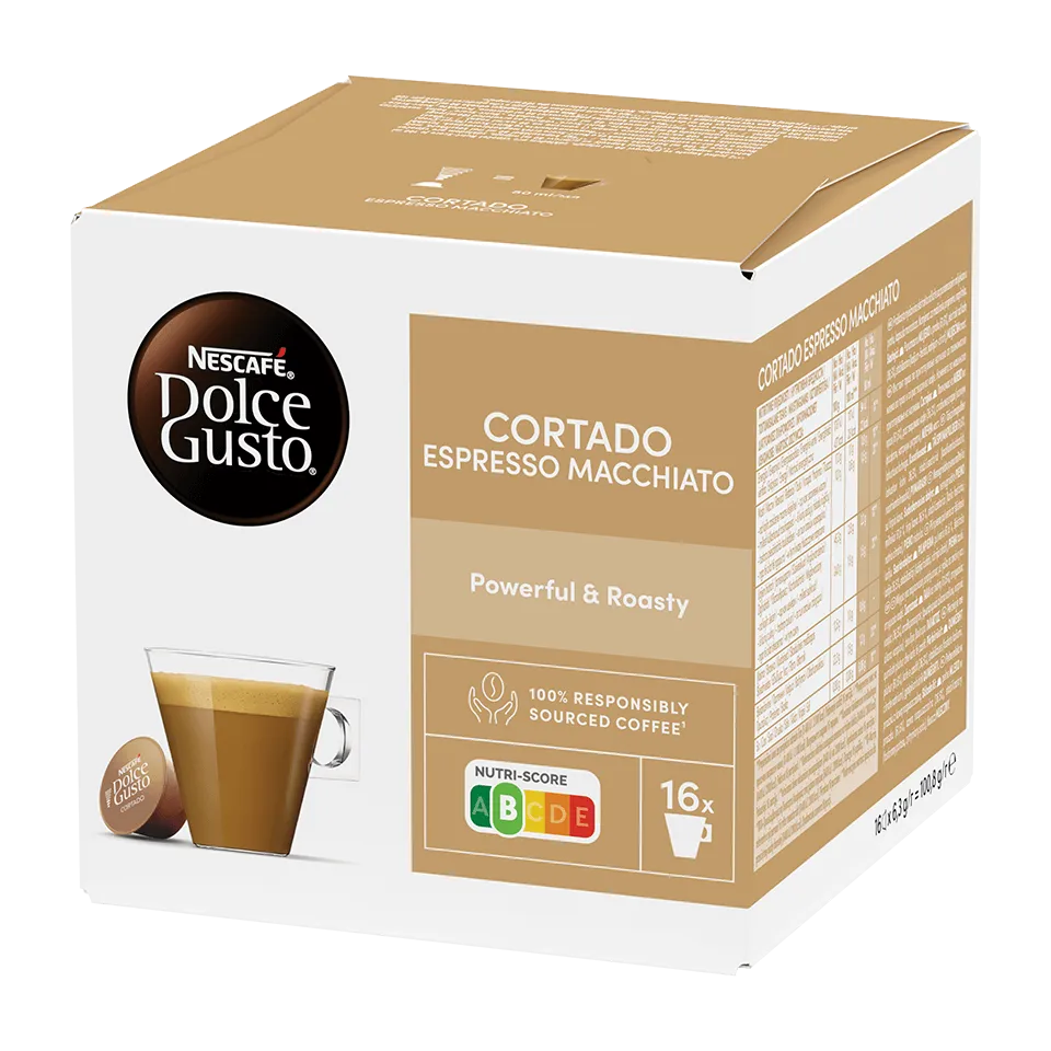 Изживейте богатите, печени нотки във всяка чаша NESCAFÉ® Dolce Gusto Cortado. Тази премиум смес от кафе зърна Арабика и Робуста предлага наситено вкусно кафе, напомнящо на печени бадеми и пекани, завършено с кадифен каймак.