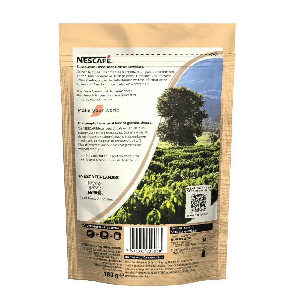 Nestlé hat sich verpflichtet, 100% des Verpackungen bis 2025 widerverwertbar oder wiederverwendbar zu machen. Die Verpackung dieses produkts hat keine Aluminiumschicht mehr, sondern besteht nur aus Kunstoff, der in bestimmten Ländern wiederverwertbar ist. In der Schweiz gibt es für diesen Kunstoff bereits einige Sammelstellen. Falls eine solche in ihrer Gemeinde noch nicht vorhanden sein sollte, können Sie den Beutel in den Haushaltsabfall werden.