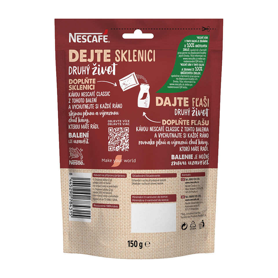 Ne, neliší se. Pro všechny kávy NESCAFÉ® CLASSIC - ať už balené v sáčku či sklenici - používáme stejnou recepturu. Vaši oblíbenou kávu si vychutnejte i tak, že použijete sklenici vícekrát a doplníte ji stejně kvalitní kávou ze znovuuzavíratelného balení.