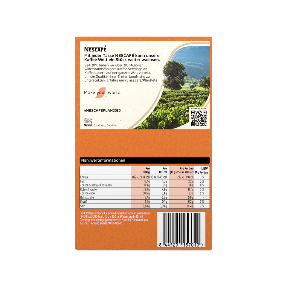 **Pro Portion (16g + 150ml Wasser) ergibt 151ml Gesamtgetränkemenge (verwendet als Basis für Nährwerte pro 100ml).