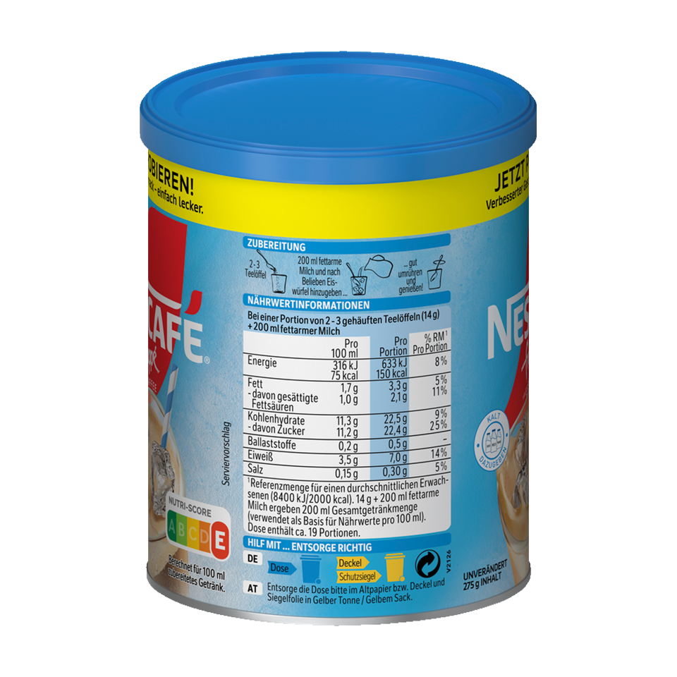 Du wunderst Dich über die Verschlechterung des Nutri-Scores. Gerne informieren wir Dich: Bei der alten Berechnungsmethode für den Nutri-Score wurde der NESCAFÉ® frappé Typ Eiskaffee aufgrund der Zubereitung mit Milch in die Berechnungskategorie „Food“ eingestuft und erhielt ein „B“. Im neuen Algorithmus gibt es keine Unterscheidung mehr zwischen der Bewertung von Getränken. Sie werden alle mit der gleichen Berechnungsmethode bewertet. Nur Wasser kann einen Nutri-Score A erreichen. Die mit der Milch verbundenen Kalorien, der Zuckergehalt und die Anzahl an gesättigten Fettsäuren führen dazu, dass der NESCAFÉ® frappé Typ Eiskaffee nun eine schlechtere Bewertung erhält.