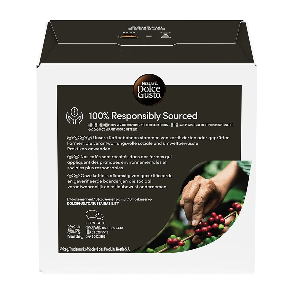 Jede Kapsel NESCAFÉ® Dolce Gusto® Espresso Intenso verspricht einen vollmundigen Espresso mit rundem Körper und samtiger Crema. Ein intensives Geschmackserlebnis, dass die Intensität des Robusta Kaffees mit den beerigen Noten eines Arabica Kaffees zu einem fruchtig-würzigen Espresso vereint.