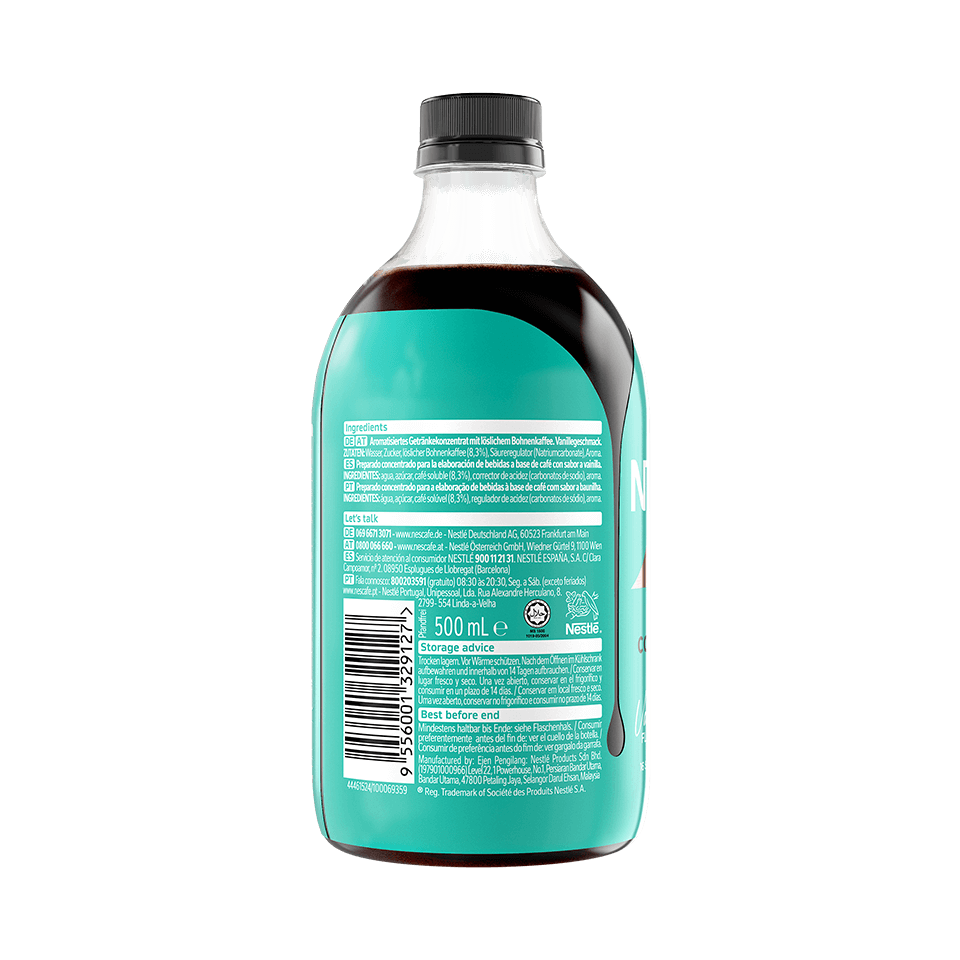 NESCAFÉ® Espresso Concentrate Vanilla enthält 94 mg Koffein pro Portion (30 ml Konzentrat).