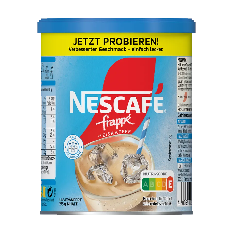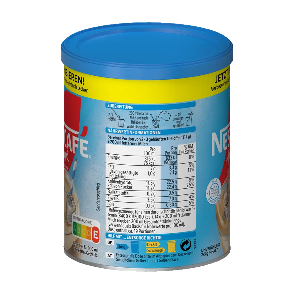 Du wunderst Dich über die Verschlechterung des Nutri-Scores. Gerne informieren wir Dich: Bei der alten Berechnungsmethode für den Nutri-Score wurde der NESCAFÉ® frappé Typ Eiskaffee aufgrund der Zubereitung mit Milch in die Berechnungskategorie „Food“ eingestuft und erhielt ein „B“. Im neuen Algorithmus gibt es keine Unterscheidung mehr zwischen der Bewertung von Getränken. Sie werden alle mit der gleichen Berechnungsmethode bewertet. Nur Wasser kann einen Nutri-Score A erreichen. Die mit der Milch verbundenen Kalorien, der Zuckergehalt und die Anzahl an gesättigten Fettsäuren führen dazu, dass der NESCAFÉ® frappé Typ Eiskaffee nun eine schlechtere Bewertung erhält.