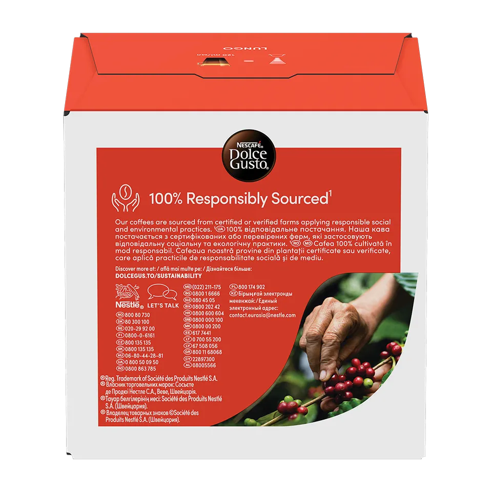 Undertoner af solbær supplerer de dejligt ristede noter i hver kop NESCAFÉ® Dolce Gusto® Lungo, der er fremstillet af Arabica-bønner af høj kvalitet fra tre udsøgte lande – der er kendte for deres kaffebønner af høj kvalitet.