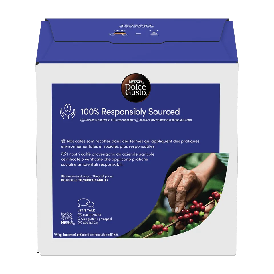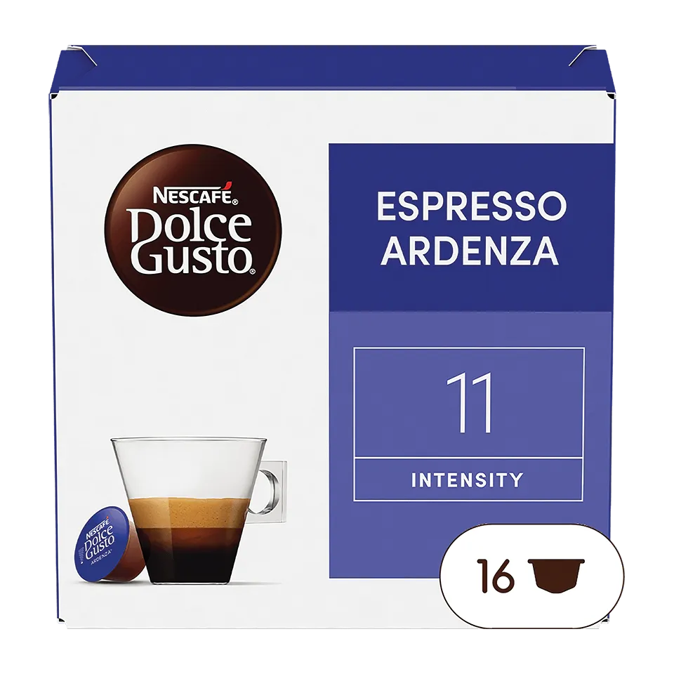 Plein de sensations fortes, de notes épicées et poivrées, l'Espresso Ardenza NESCAFÉ® Dolce Gusto® est un mélange de grains d'Arabica et de Robusta de première qualité, intensément torréfiés, qui donne un espresso spectaculairement audacieux, sublimé d'une belle crema* dense et dorée.