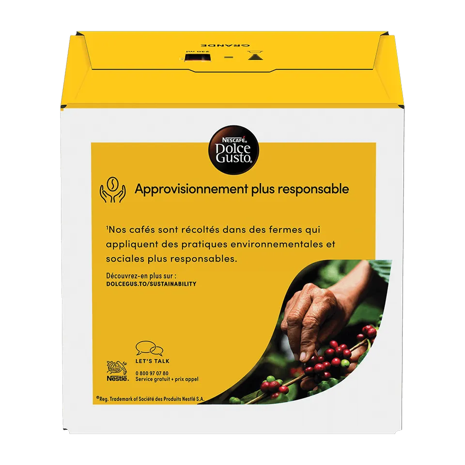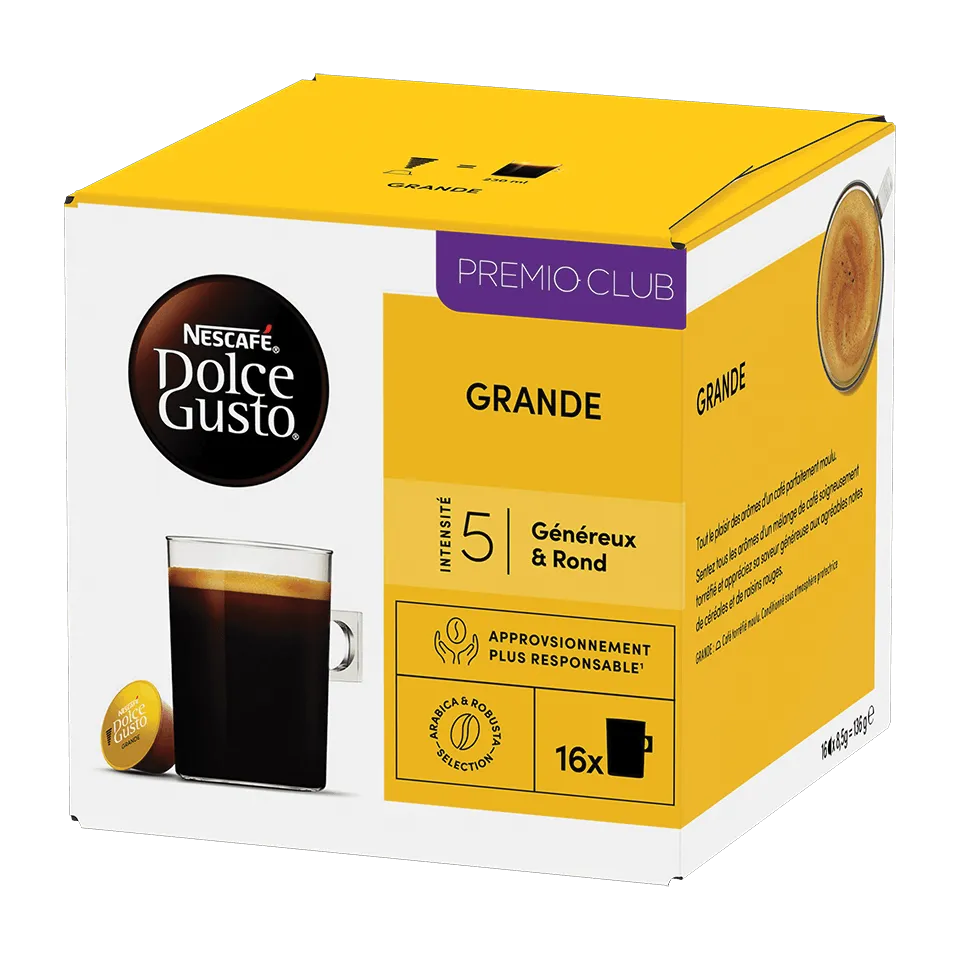 Chaque capsule Grande NESCAFÉ® Dolce Gusto® s'exprime avant même que vous ne preniez la première gorgée. Remplissant la pièce d'un arôme de café fraîchement torréfié, débordant d'une saveur riche et sublimé d'une crema* soyeuse, c'est un café qui donne un nouveau sens au mot "artisanal".