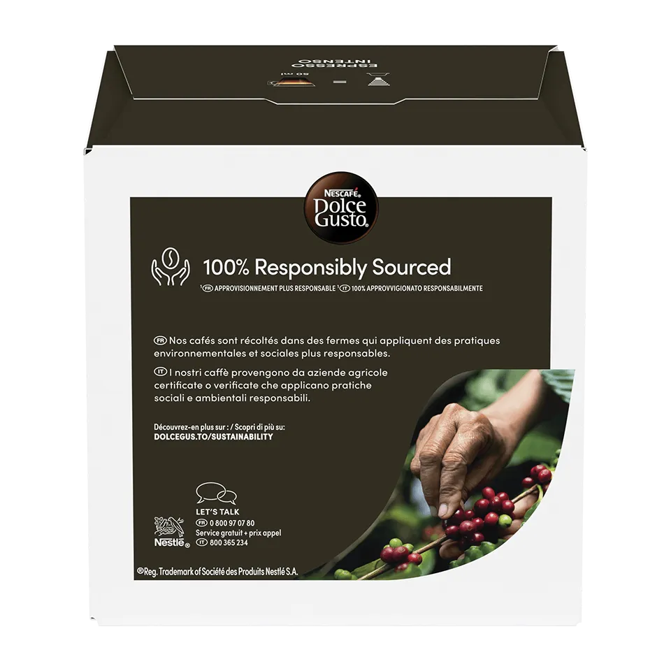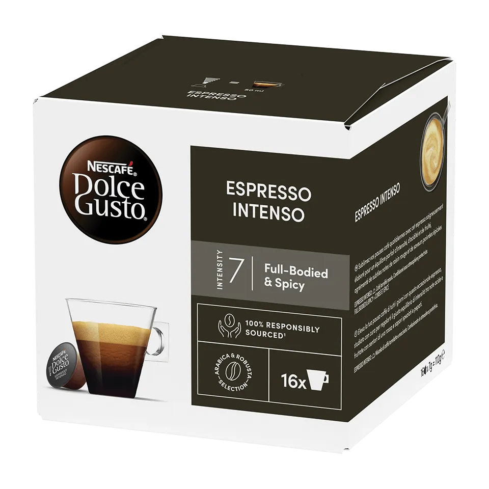 Chaque capsule Espresso Intenso NESCAFÉ® Dolce Gusto® vous offre un espresso riche et corsé, sublimé par une crema* veloutée. Épicé, avec des notes fruitées de baies rouges, cet espresso plein d'arômes est une expérience délicieusement intense.