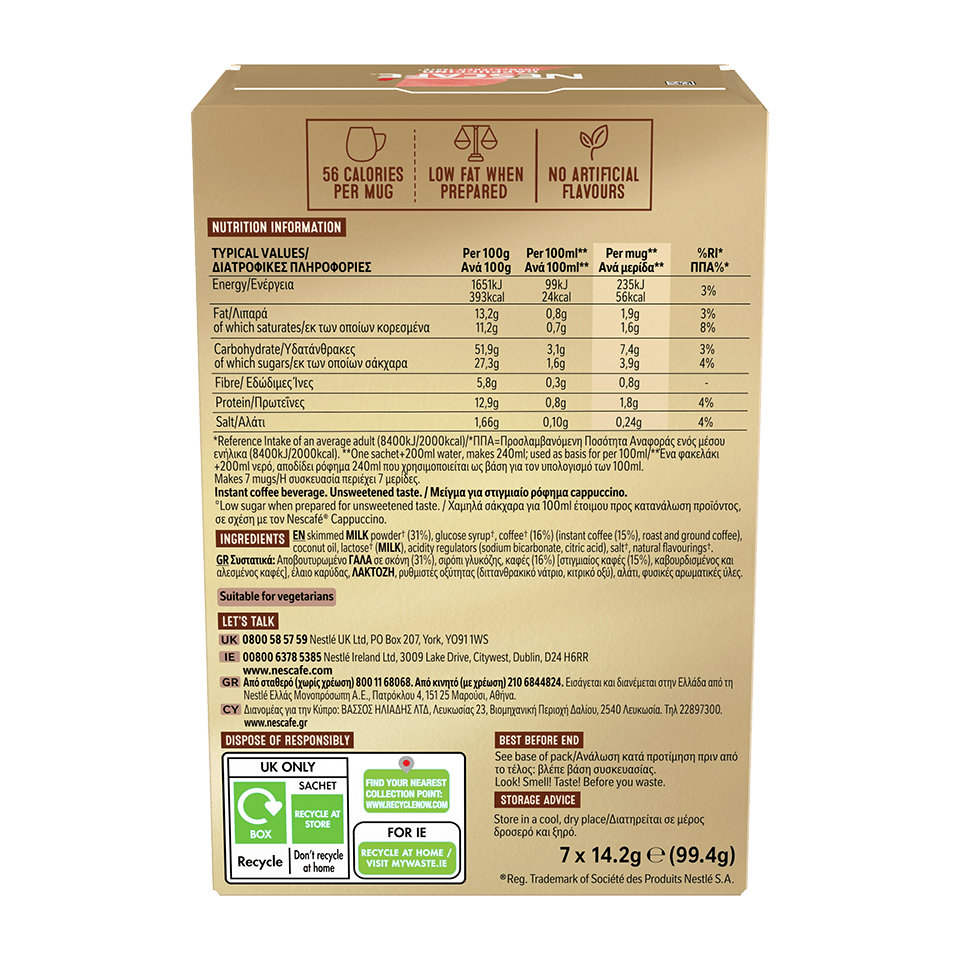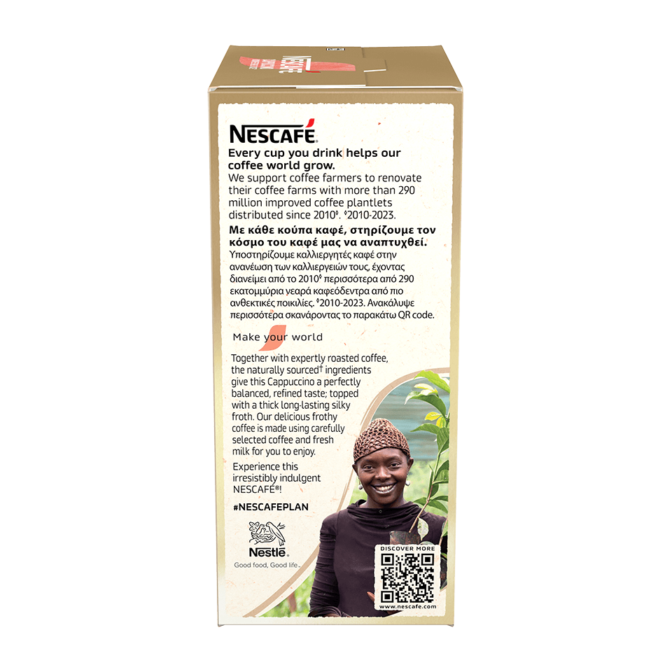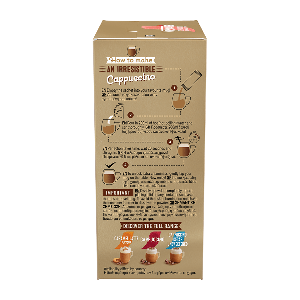 Με βελούδινη κρέμα και εκλεκτούς κόκκους καφέ, ο NESCAFÉ® Cappuccino Unsweetened Taste σου δίνει την ευκαιρία να απολαύσεις τη γεύση ενός αυθεντικού cappuccino, από την άνεση του σπιτιού σου με λιγότερη γλυκύτητα σε σχέση με τον NESCAFÉ® Cappuccino.
