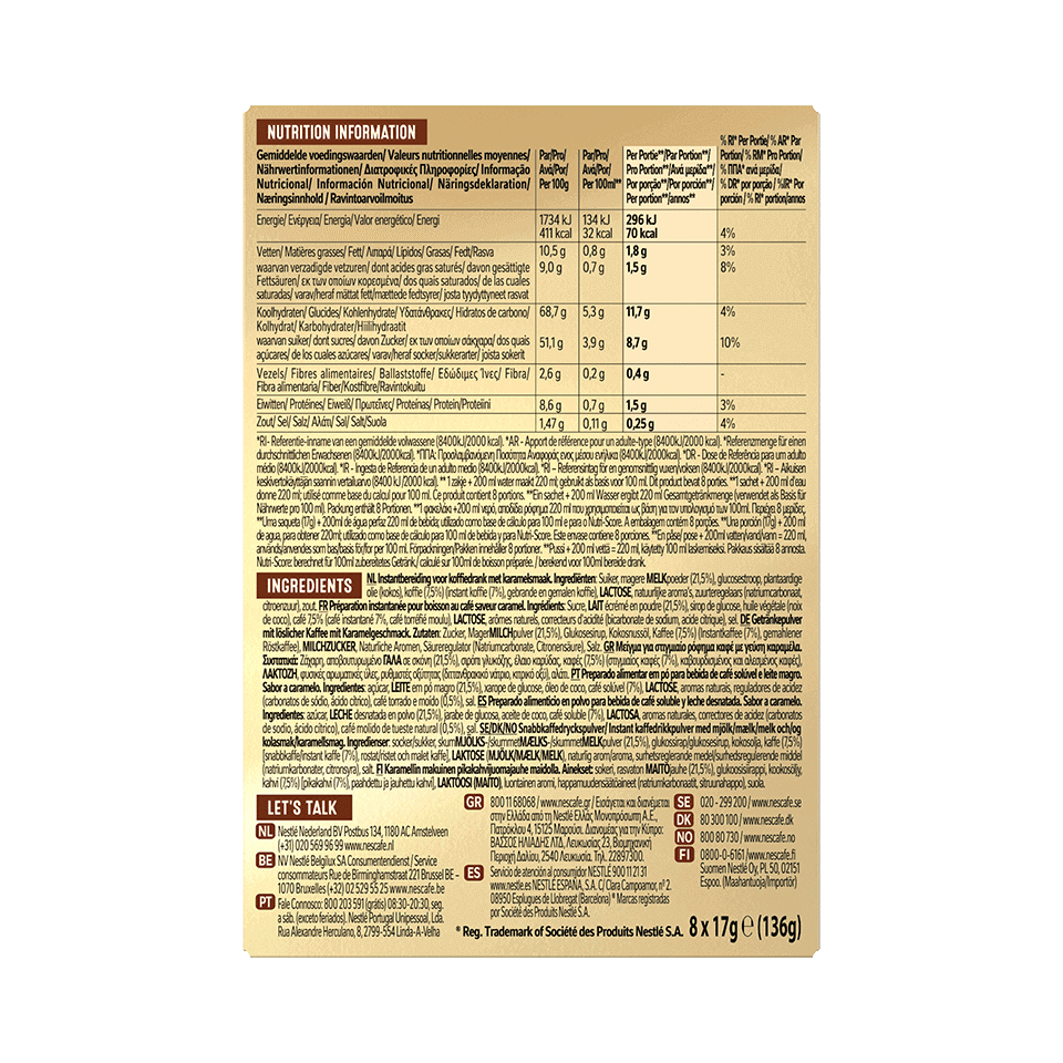 Αυτή η παραλλαγή του κλασικού αγαπημένου καφέ έχει δημιουργηθεί με υψηλής ποιότητας κόκκους καφέ, απολαυστικό γάλα και μια νότα γεύσης καραμέλας. Απλά προσθέτεις ζεστό νερό αφού αδειάσεις το φακελάκι NESCAFÉ® Caramel Latte στην κούπα, ανακατεύεις και απολαμβάνεις. Ήξερες ότι διαθέτουμε μια μεγάλη ποικιλία από ροφήματα; Ανακάλυψε κι άλλες παραλλαγές του κλασικού latte, όπως ο NESCAFÉ® Vanilla Latte ή ο NESCAFÉ® Hazelnut Latte.