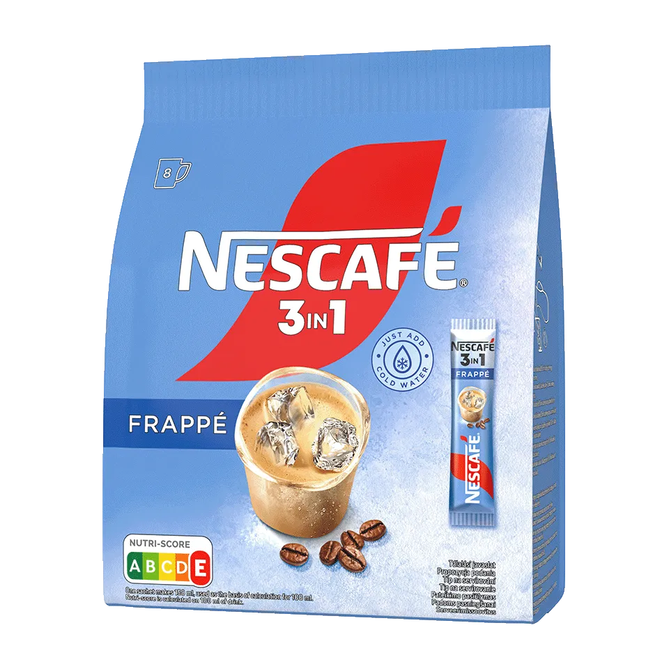 Fedezd fel a NESCAFÉ® 3in1 Frappé-t. Ellenállhatatlanul frissítő jeges kávé, amelyet pillanatok alatt elkészíthetsz! Élvezd bármikor és bárhol, készítsd el egyszerűen, csak adj hozzá hideg vizet és némi jeget, ahogy igazán szereted!