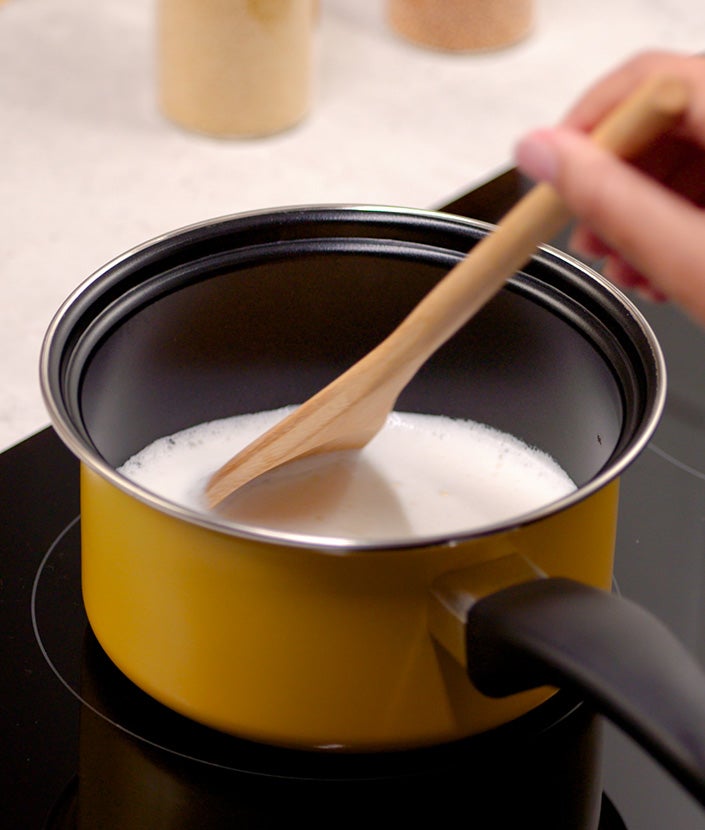 Tűzhelyen melegíts össze 120 ml tejet 1 evőkanál fehércsokoládé sziruppal közepes hőfokon