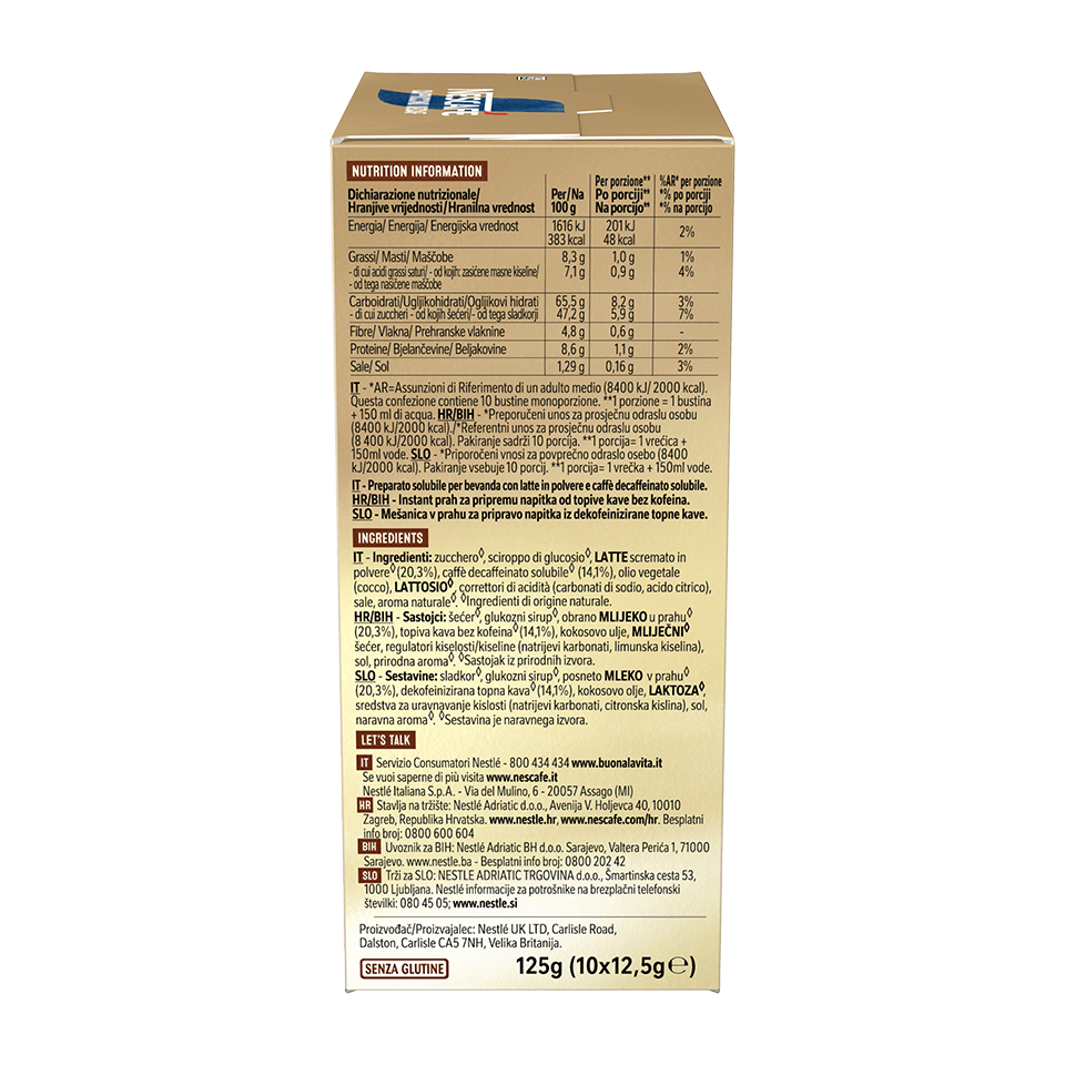 ** 1 porzione = 1 bustina (12,5 g) + 150 ml di acqua. La confezione contiene 10 bustine monoporzione.