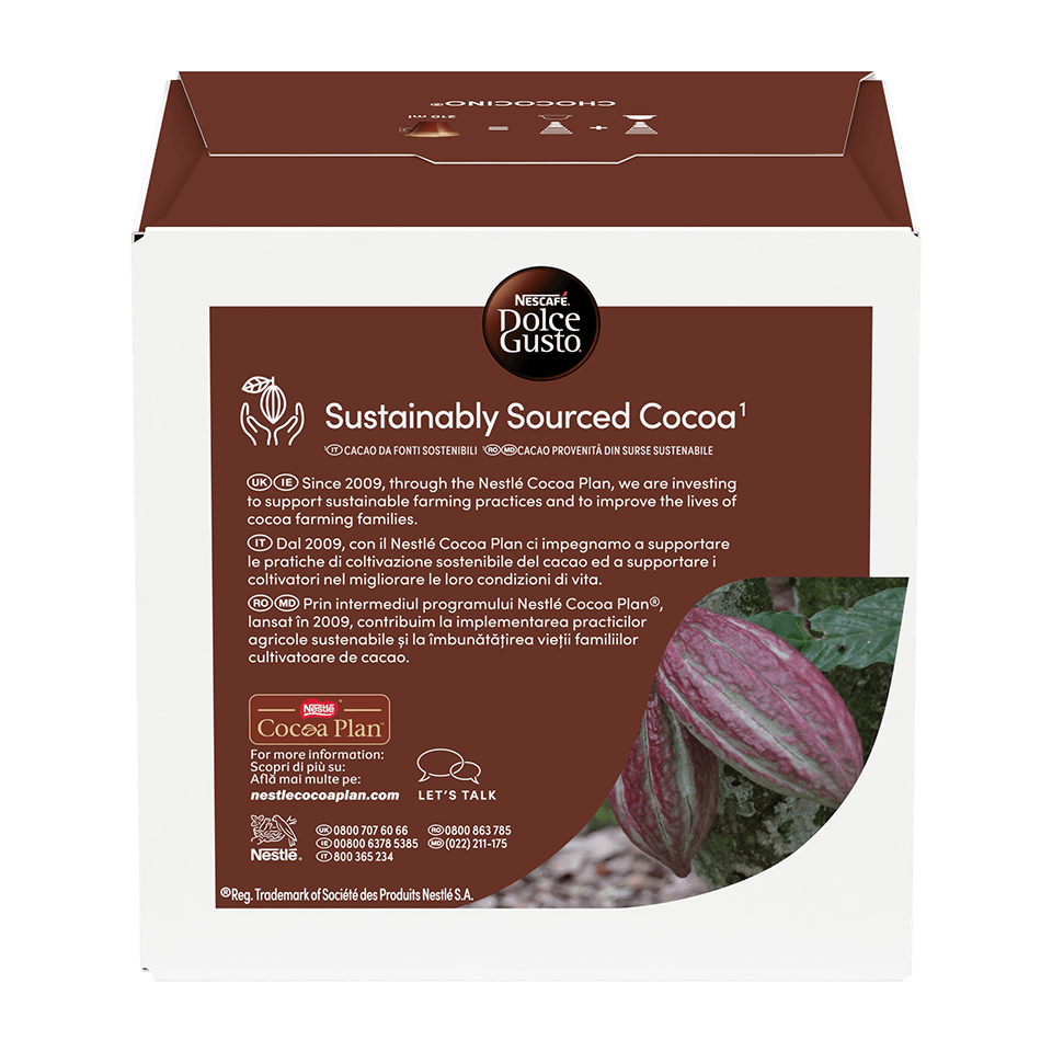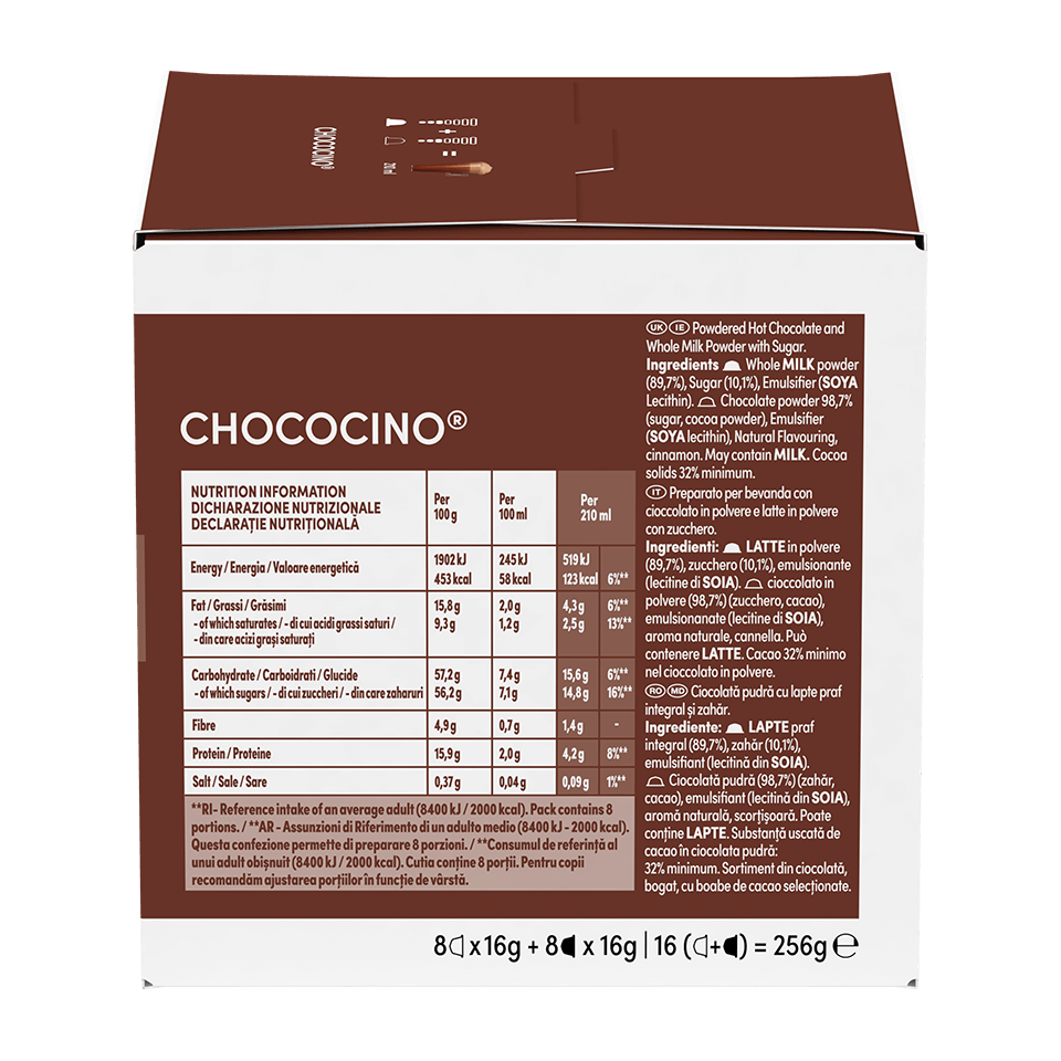 Bastano solo pochi secondi per cedere alla tentazione del nostro irresistibile Chococino. Assapora la texture generosa e il gusto intenso del cioccolato in polvere, realizzato con fave di cacao della miglior qualità e arricchito da note di vaniglia.