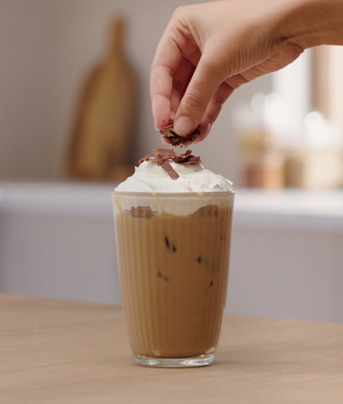 더 풍부하게 즐기고 싶다면? 프라페 위에 휘핑크림과 초콜릿 조각을 얹어보세요.