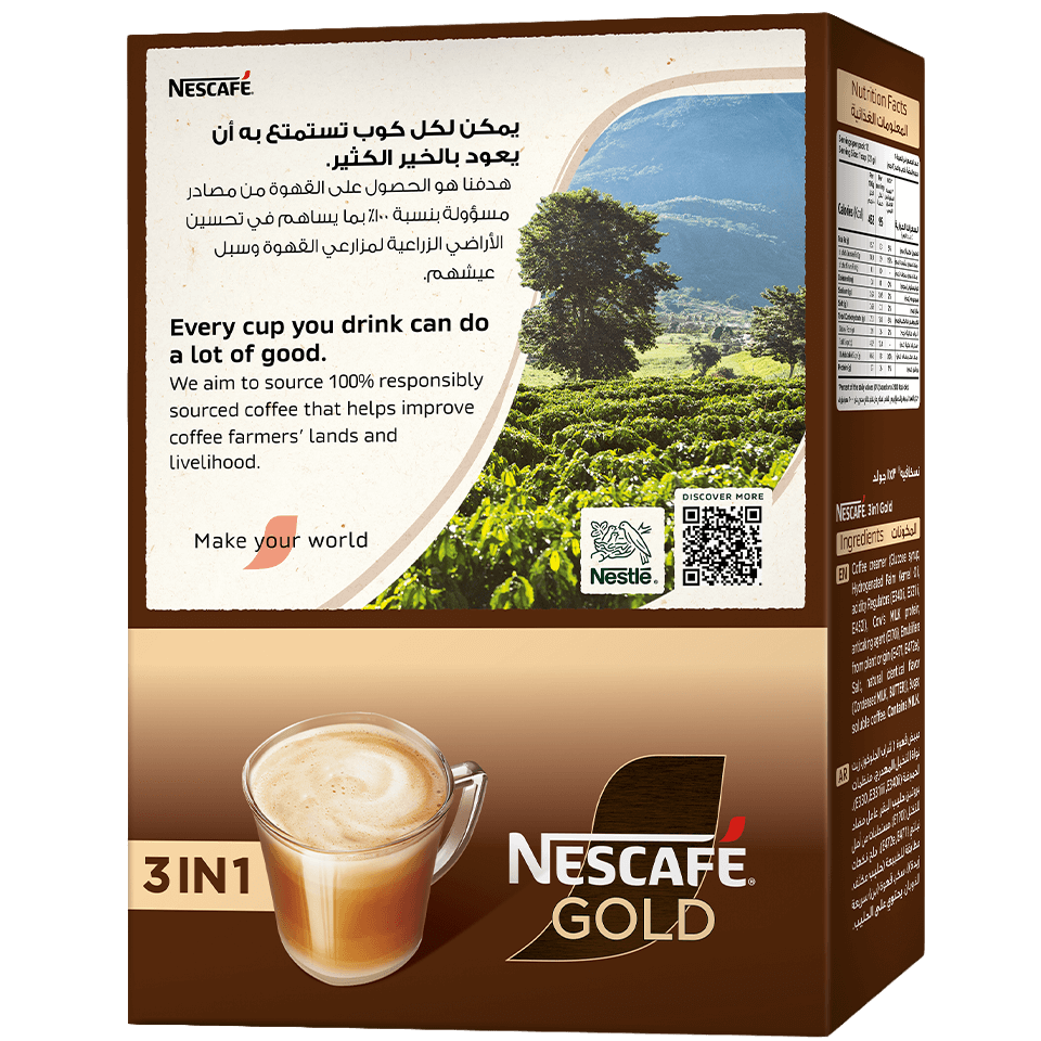 حان الوقت لاكتشاف أكياس القهوة نسكافيه® 3في1. مزيج لذيذ من القهوة والكريمة والسكر، للحظة نسكافيه® عندما تحتاجها أكثر. مزيج حبوب القهوة الفاخرة المختار بعناية والمحمص متوسط الداكن باحترافية هو أساس أكياس نسكافيه® 3في1. مع توازن مثالي بين الكريمر والسكر، ستحصل على كوب قهوة غني وناعم في ثوان.