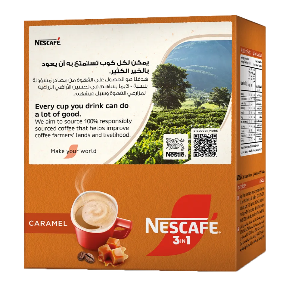 حان الوقت لاكتشاف أكياس قهوة نسكافيه ® 3في1 بنكهة الكراميل. مزيج لذيذ من القهوة، والكريمة، والسكر، ونكهة الكراميل، لتجربة نسكافيه ® في اللحظة التي تحتاجها أكثر.