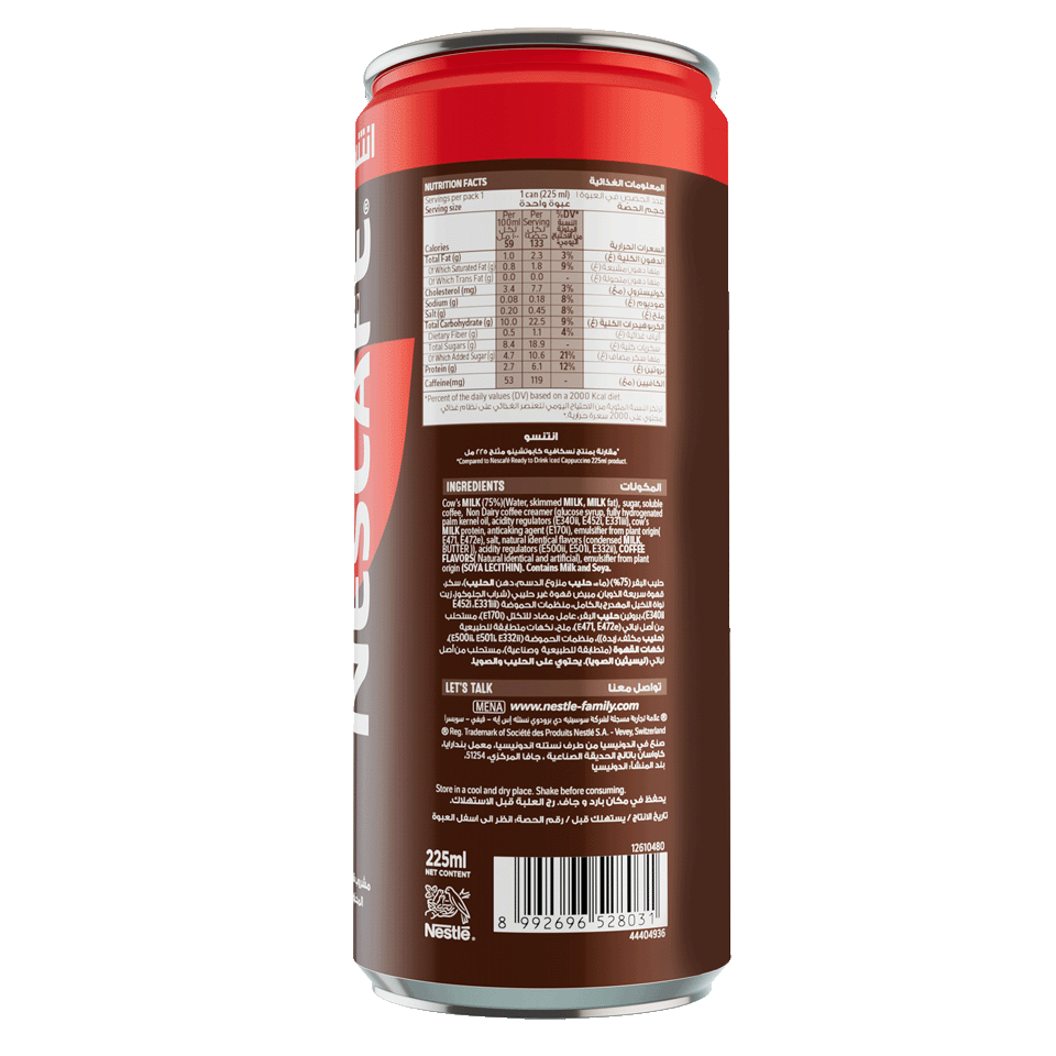 تحتوي قهوة نسكافيه® المثلجة عالماشي على اللاكتوز حيث أن الحليب هو إحدى مكوناتها.