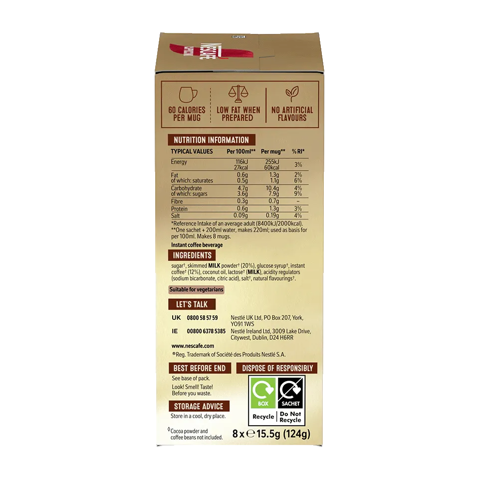 Our cartons are made of paper which is 100% recyclable. The sachets are made from a laminate material that is not currently recyclable. We are looking to roll out more recyclable packaging to meet our commitment to make all of our packaging recyclable or reusable by 2025.