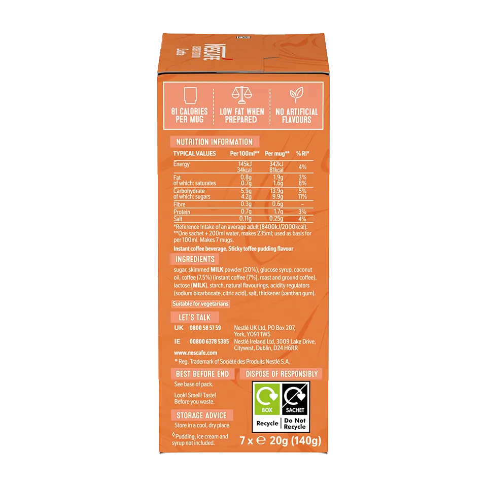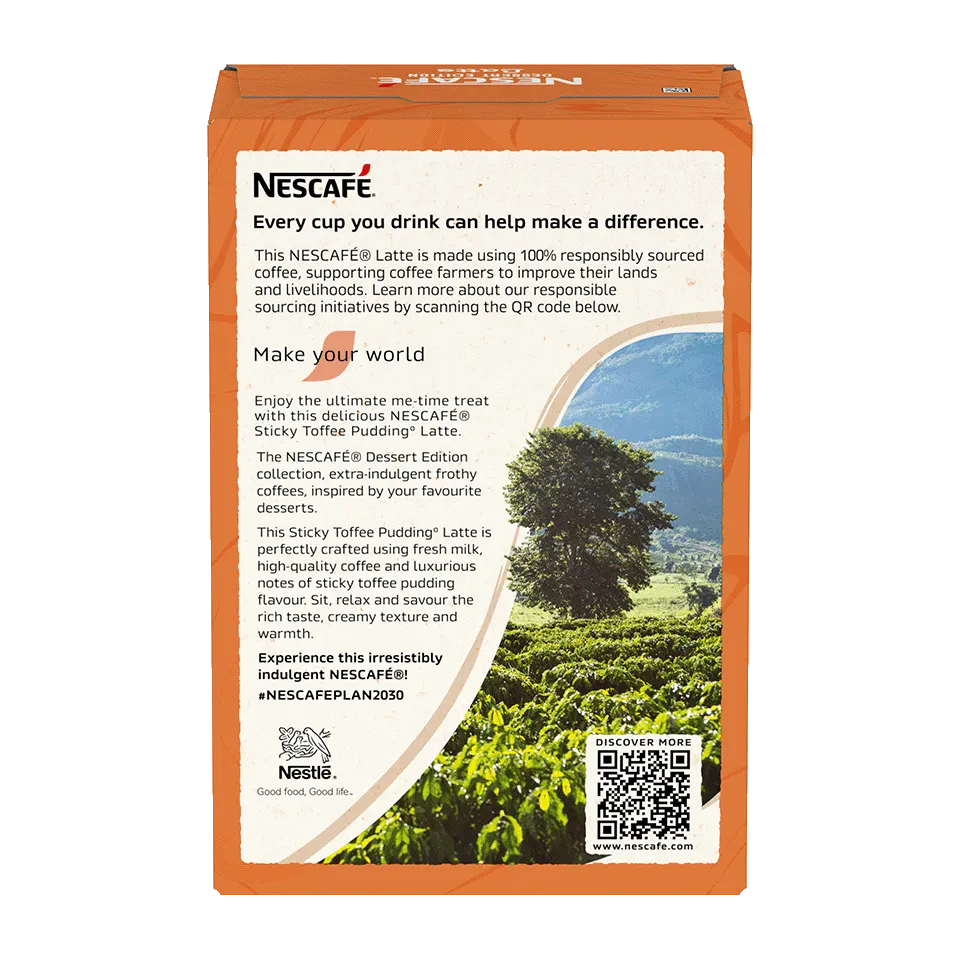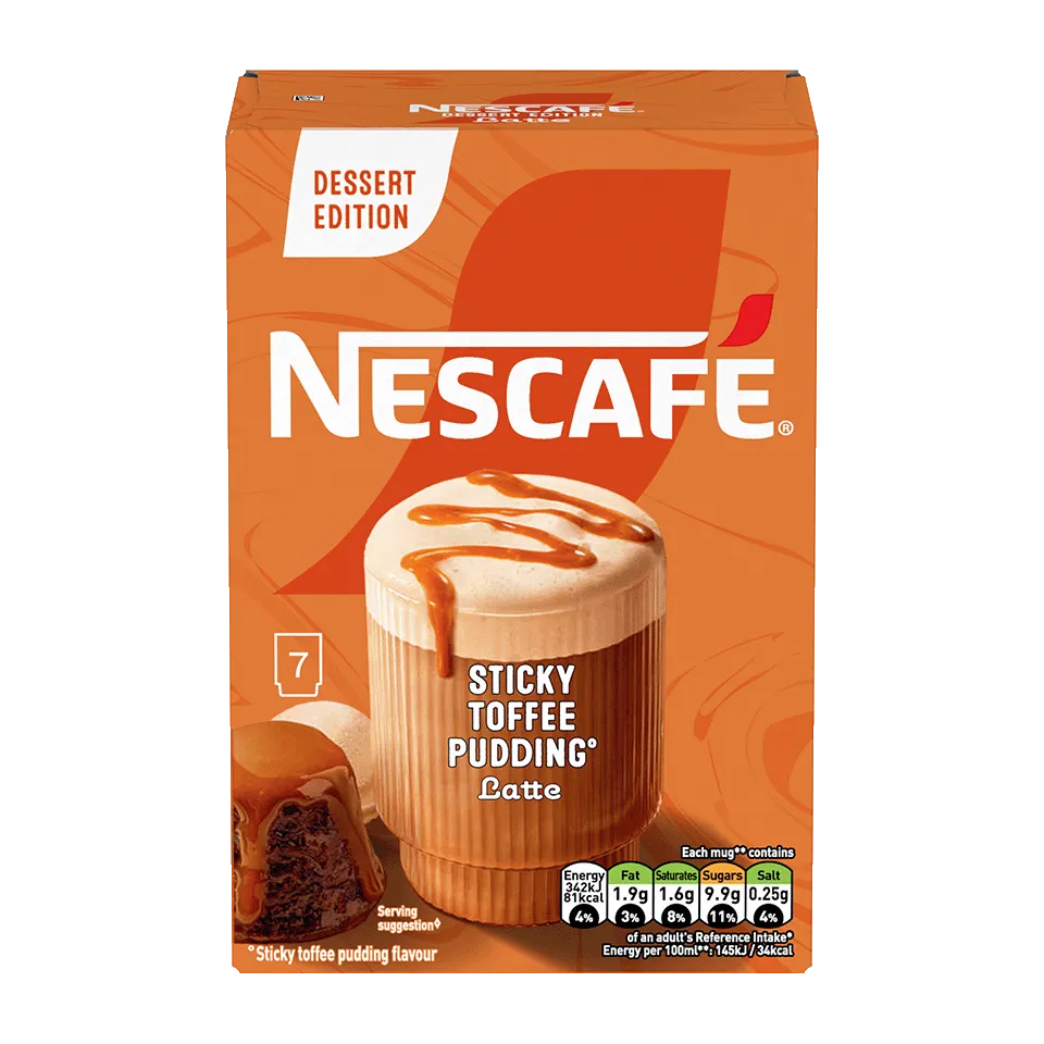 The NESCAFE Dessert Edition collection, extra indulgent frothy coffees, inspired by your favourite desserts: Sticky Toffee Pudding Latte and NEW Vanilla Cookie Dough Latte. Sit back, relax, and savour the rich taste, creamy texture, and warmth. Our Dessert Editions are made using delicious fresh milk and high-quality coffee. In convenient sachets to give you that perfect indulgent mem-moment anytime anywhere.