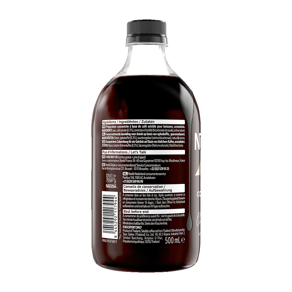 Een standaard portie NESCAFÉ® Espresso Concentrate Style is ongeveer 30 ml. In een fles van 500 ml NESCAFÉ® Espresso Concentrate Style zitten 16 porties. Onze standaard portie van 30 ml NESCAFÉ® Espresso Concentrate Style is gebaseerd op het toevoegen van 150 ml melk of een andere vloeistof naar keuze.