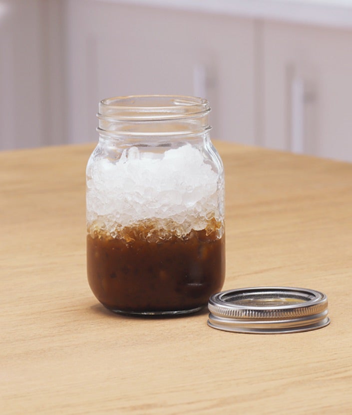 Plasser knust is i et syltetøyglass over kaffeblandingen
