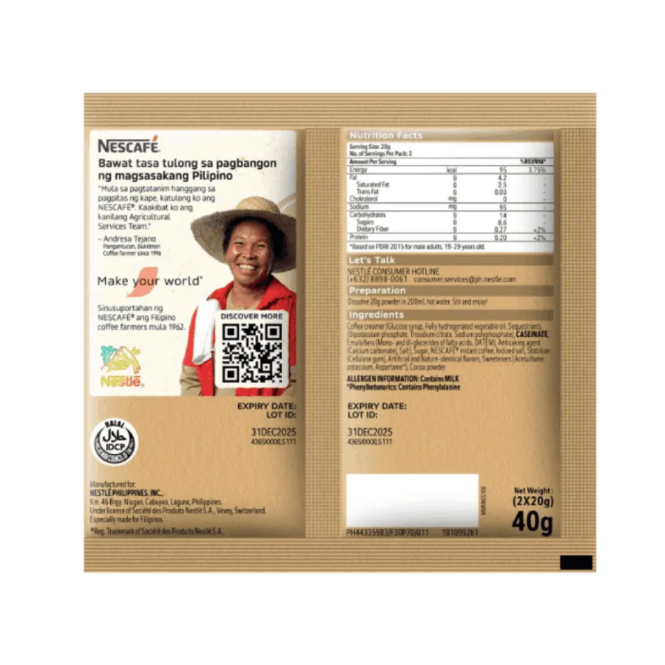Sugar, Coffee creamer [Glucose syrup, Hydrogenated vegetable oil, Sequestrants (Dipotassium phosphate, Trisodium citrate, Sodium polyphosphate), CASEINATE, Emulsifiers (Mono- and di-glycerides if fatty acids, DATEM), Anticaking agent (Calcium carbonate), Salt], Sugar, Maltodextrin, NESCAFÉ® instant coffee, Iodized salt, Stabilizer (CMC), Artificial Nature-identical flavor, Sweetener (Acesulfame potassium), Cocoa powder.
