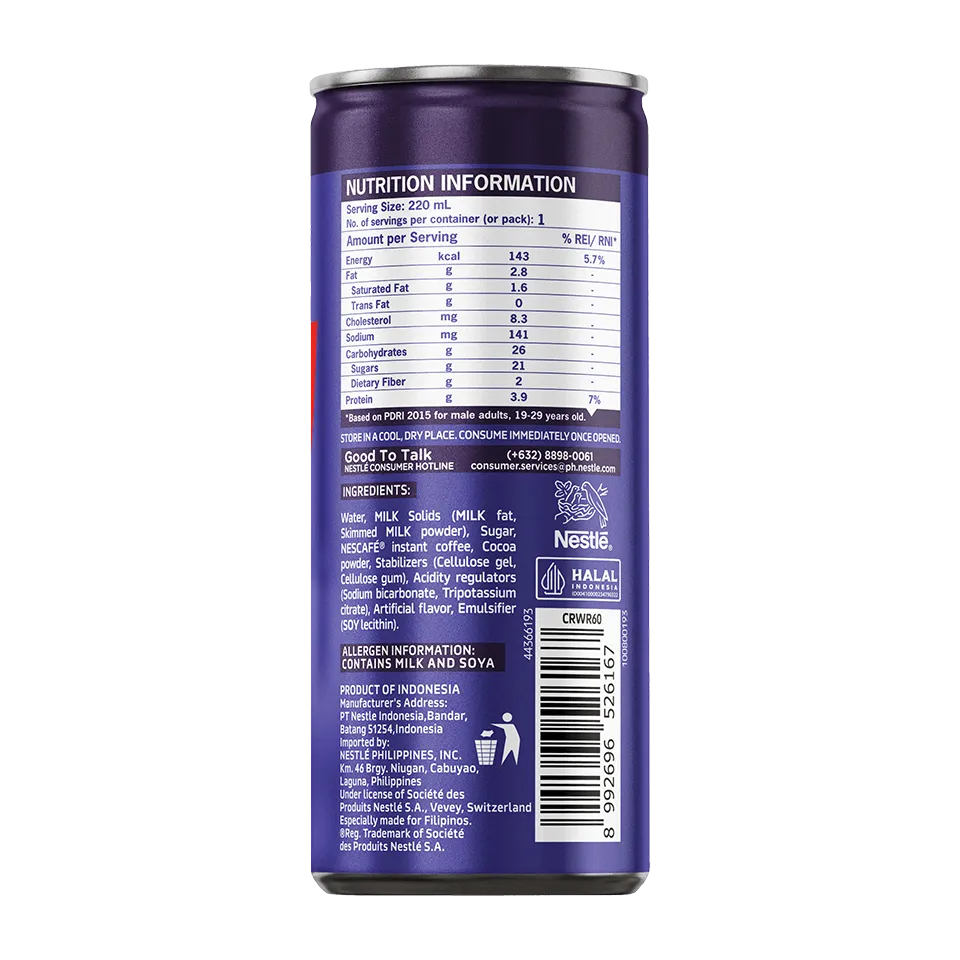 Water, MILK Solids (MILK fat, Skimmed MILK powder), Sugar, NESCAFÉ® instant coffee, Cocoa powder Stabilizers (Cellulose gel, Cellulose gum), Acidity regulators (Sodium bicarbonate, Tripotassium citrate), Artificial flavor, Emulsifier (SOY lecithin).