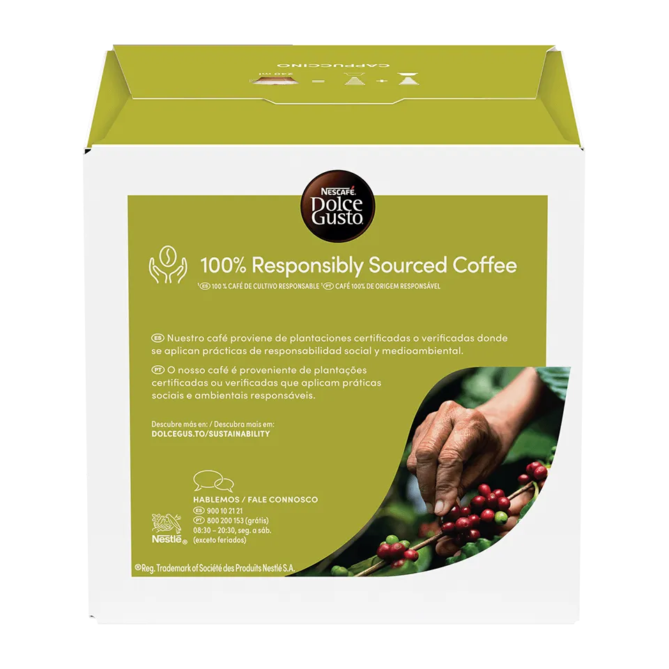 Um cappuccino define-se por 3 elementos: uma deliciosa base de café expresso, com um equilíbrio igual de leite vaporizado e uma espuma de leite densa e aveludada. Cada cápsula NESCAFÉ® Dolce Gusto® Cappuccino representa o equilíbrio ideal entre os 3 elementos. É só tocar no botão.