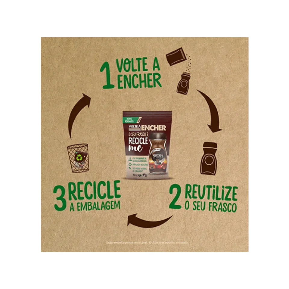 Encher e voltar a encher o seu frasco de NESCAFÉ é fácil e mais sustentável. Explicamos-lhe porquê. Com o nosso novo formato refill, agora pode dar uma segunda vida ao seu frasco, voltando a enchê-lo. Garantimos o seu sabor de sempre, enquanto contribui na redução do desperdício de embalagem. O formato refill é mais leve, utilizando 97% menos embalagem quando comparado com o frasco de vidro*. Agora pode fazer uma escolha mais sustentável, enquanto desfruta do mesmo café puro e suave que conhece. Depois de encher o seu frasco em casa, e porque a embalagem é reciclável, deve colocá-lo no ecoponto amarelo.