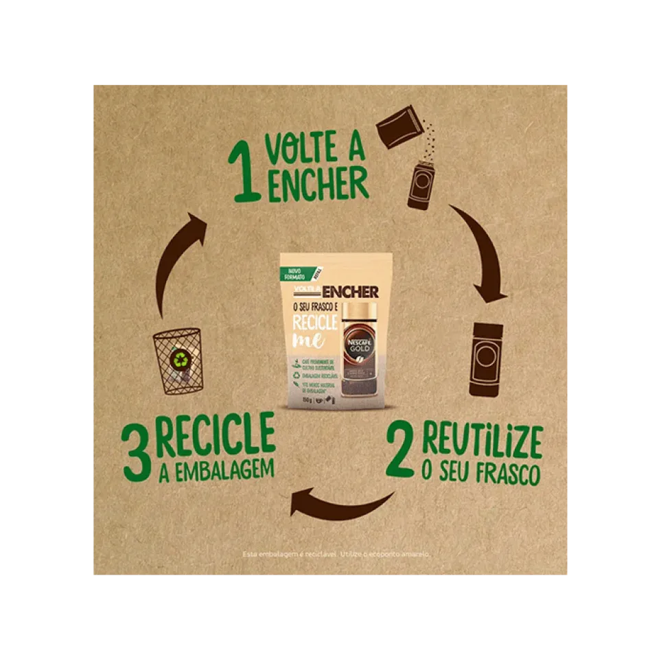 Encher e voltar a encher o seu frasco de NESCAFÉ é fácil e mais sustentável. Explicamos-lhe porquê. Com o nosso novo formato refill, agora pode dar uma segunda vida ao seu frasco, voltando a enchê-lo. Garantimos o seu sabor de sempre, enquanto contribui na redução do desperdício de embalagem. O formato refill é mais leve, utilizando 97% menos embalagem quando comparado com o frasco de vidro*. Agora pode fazer uma escolha mais sustentável, enquanto desfruta do mesmo café puro e suave que conhece. Depois de encher o seu frasco em casa, e porque a embalagem é reciclável, deve colocá-lo no ecoponto amarelo.