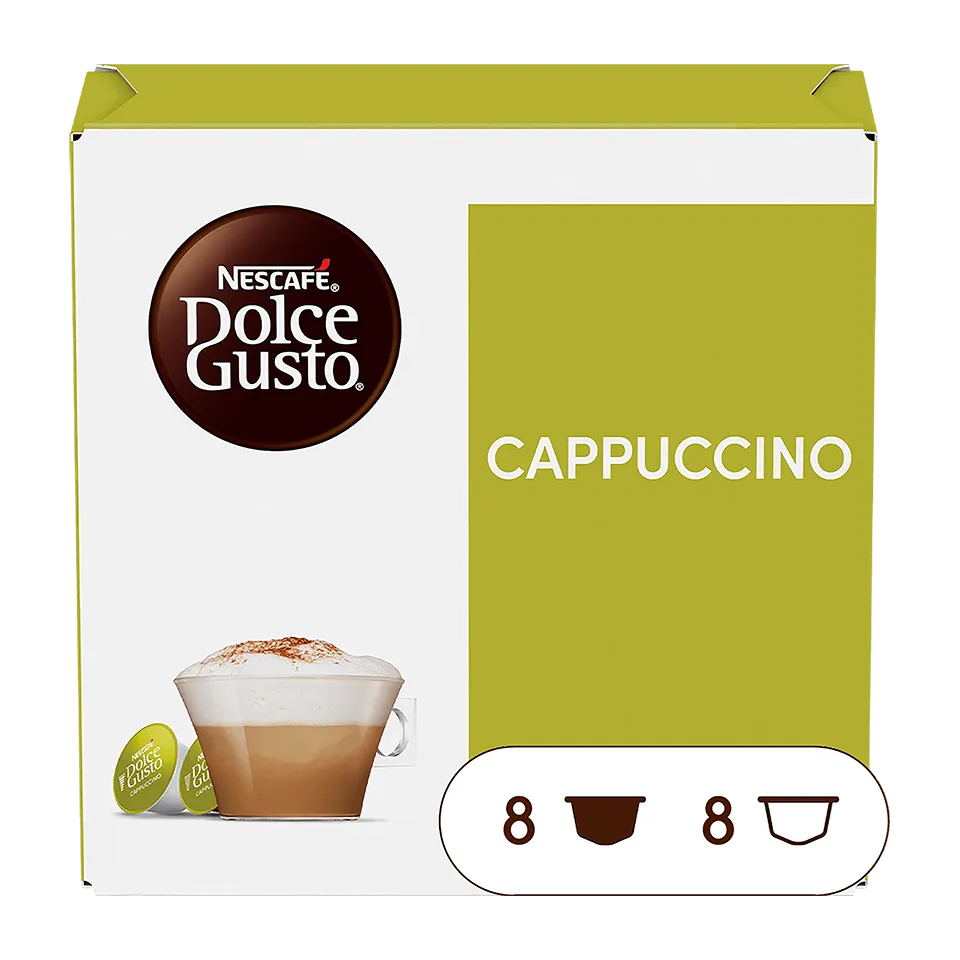 Un cappuccino este definit de 3 elemente - o bază delicioasă de espresso, cu un adaos egal de lapte fierbinte și o spumă de lapte densă și catifelată. Fiecare capsulă NESCAFÉ® Dolce Gusto® Cappuccino prepară în echilibru aceste trei elemente , la atingerea unui buton.