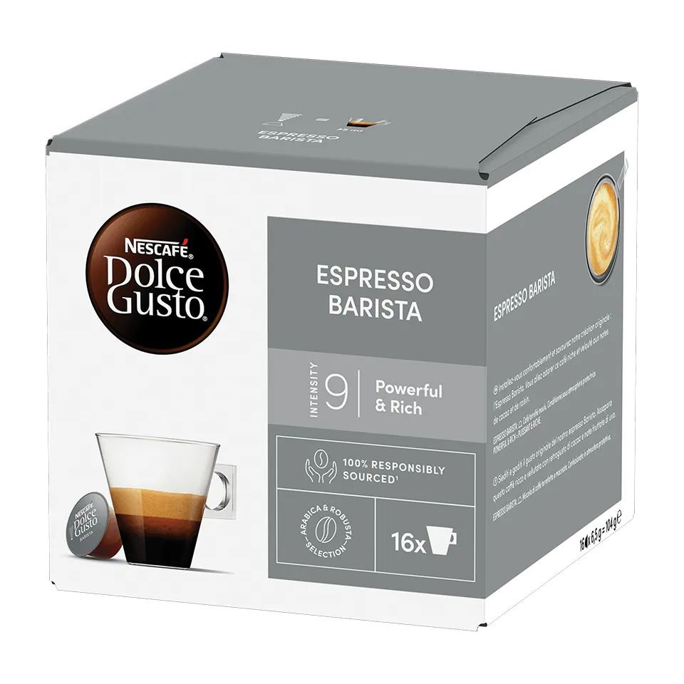 Probrana zrna Arabice i Robusta kafe dobijena sa naših farmi u pojasu kafe tajna su koja stoji iza svake kapsule ukusne i bogate NESCAFÉ® Dolce Gusto® Espresso Barista kafe.