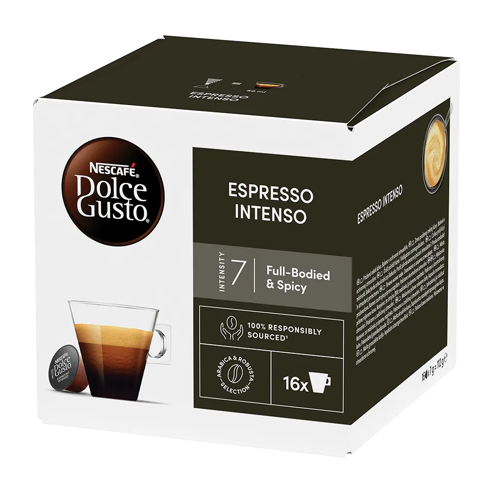 NESCAFÉ® Dolce Gusto® Espresso Intenso uravnotežena je kombinacija zrna sa suprotnih strana planete. Zrna Arabice iz Kolumbije i zrna Robuste iz Vijetnama stvaraju harmoničan spoj za spektakularan, okrepljujuće intenzivan espreso.