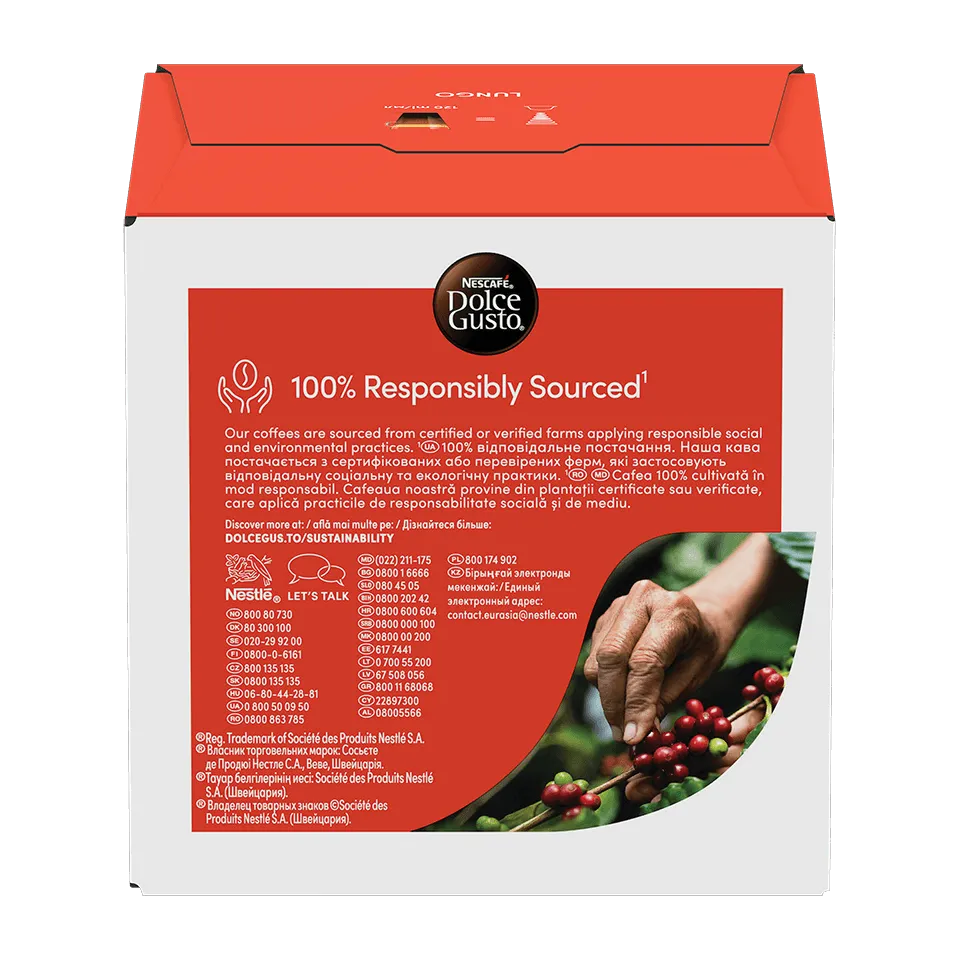 Undertoner av svarta vinbär kompletterar de härligt rostade tonerna i varje kopp NESCAFÉ® Dolce Gusto® Lungo. Kaffet innehåller högkvalitativa Arabicabönor från tre länder som alla är kända för sina kaffebönor av hög kvalitet.