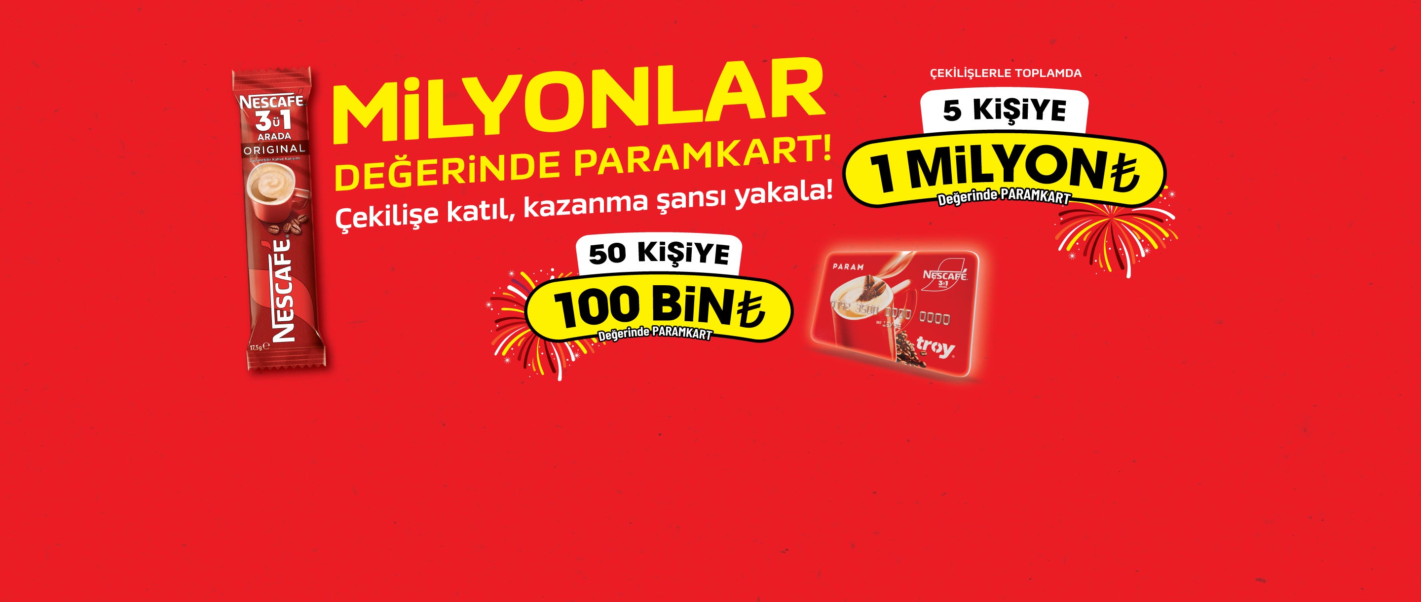 Nescafé 3ü1 Arada Ulusal Promosyon Kampanyası 1 Kasım 2025'te başlıyor! 1 Kasım'dan itibaren SMS, web sitemiz veya NE'APP üzerinden Nescafé 3ü1 Arada ambalajlarındaki şifreleri göndererek, çekilişlerle toplamda 50 adet 100.000 TL ve 5 adet 1.000.000 TL değerindeki Nescafé Paramkartlar'dan birini kazanma şansı yakalayın!
