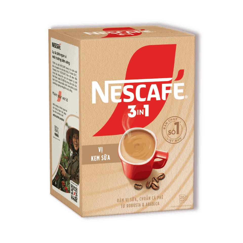 Bột kem pha cà phê (44%) (có chứa sữa), đường, cà phê hòa tan Robusta và Arabica (8%), sữa bột tách kem (4,5%), chất ổn định 1440, hương liệu (giống tự nhiên, tổng hợp) (có chứa sữa), muối i-ốt, chất điều chỉnh độ acid 500(ii), chất tạo ngọt tổng hợp acesulfam kali.